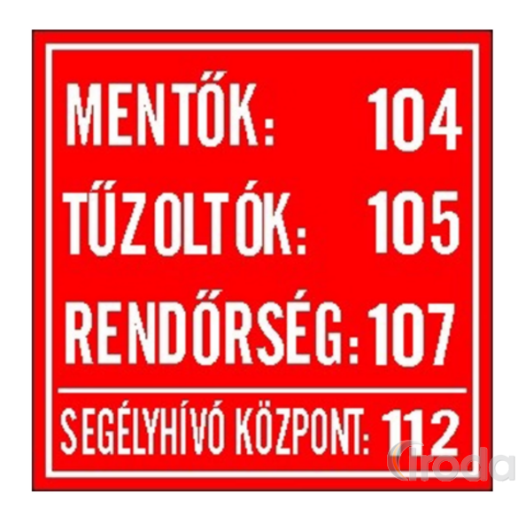 Információs matrica , piros, 100x100 mm Mentők:110; Tűzoltók:105; Rendőrség:107 363-01021