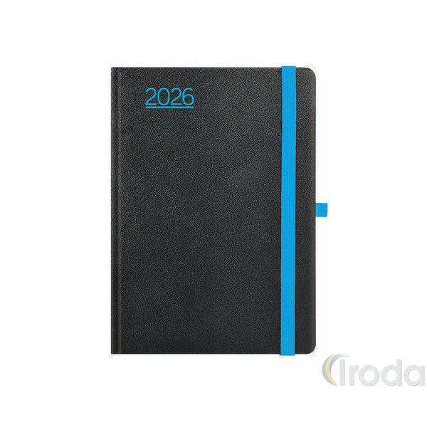 Agenda A5 heti Top Timer Nero fekete borító, kék gumiszalag, fehér lap, 2026.év
