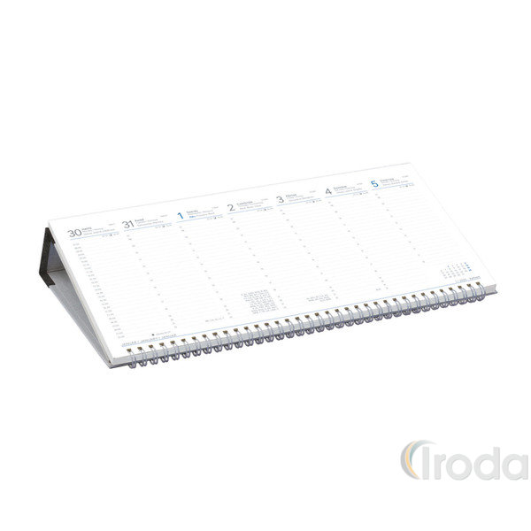 Műbőr táblával készült, fehér tömbös, fekvő asztali naptár.Szitázással, présfólia- és vaknyomással emblémázható. 32x15cm