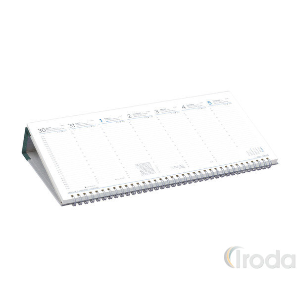 Holland műbőrrel bevont tartóval forgalmazott fehér tömbös, fekvő asztali naptár. A dőlésszög ergonomikus használatot biztosít. Ez a naptár hasznos kiegészítője lehet íróasztalának, otthonának. Jellemzői: Kiváló minőségű holland műbőr. Naptárbeosztás: 6-22 óráig, 8-18 óráig félórás bontásban. Teljes szombat-vasárnap. 54 lap. Tömbméret: 325 × 155 mm. Reklámfelület (a gerincen): 330 × 50 mm