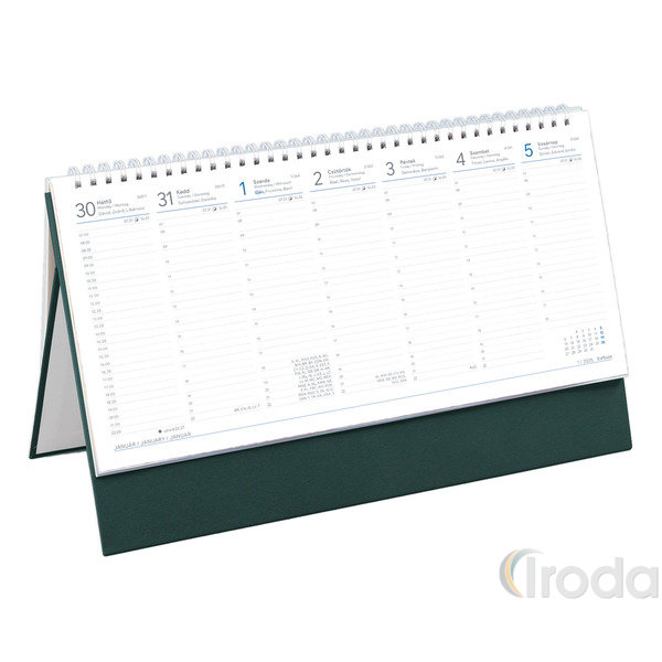 Asztali naptár Top Timer T051 fehér tömbös, álló zöld műbőrbevont karton hátlappal, félórás beosztás, 325x155mm 2026.év