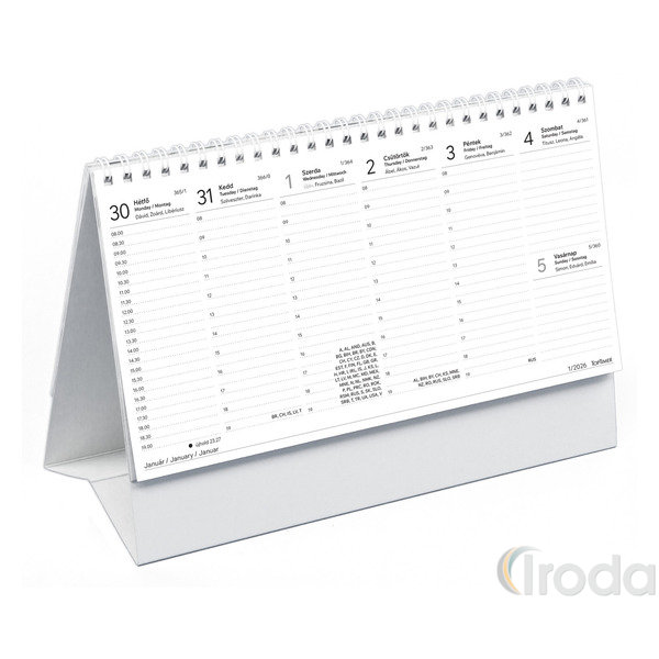 Papírtáblás, fehér tömbös, álló asztali naptár.Szitázással emblémázható.