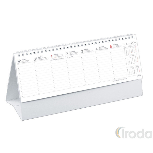 Papírtáblás, fehér tömbös, álló asztali naptár.Szitázással emblémázható. Mérete: 290x100mm