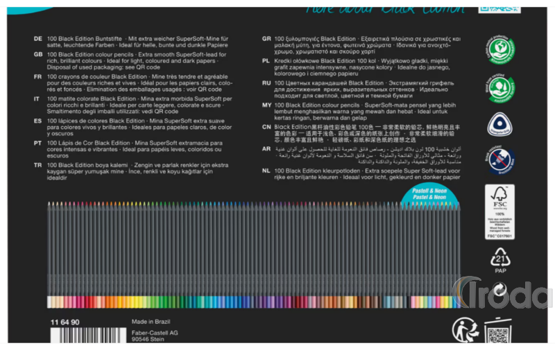 Faber-Castell Black Edition színes ceruza készlet. -készlet a színösszeállításában képzőművészek javaslatait is figyelembe vették. -ergonómikus háromszögletű színes ceruza. -fekete ceruzatest rendkívül lágy grafitbéllel. -lágy vonalvezetés, kiváló fedél színes és sötét papíron is. -törésbiztos ceruzabél (SV rendszer). -FSC minősített fa alapanyag. -karbonsemleges termék. (F-202601) (fa-202602)