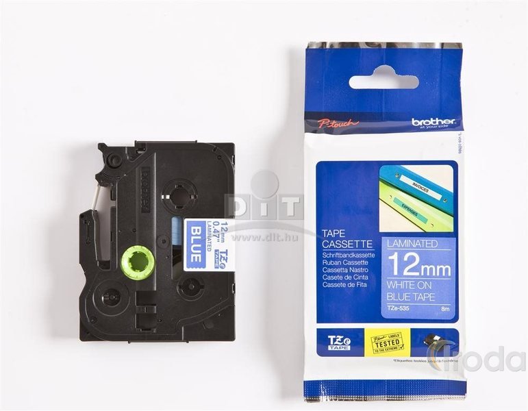 12 mm széles, 8 m hosszú, kék alapon fehér betűs, öntapadós címkeszalag laminált tartós feliratok nyomtatásához.