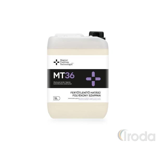 MT36 Fertőtlenítő folyékony szappan 5L. Színtelen. Fertőtlenítő hatású folyékony szappan, higiéniás kézfertőtlenítésre. Antimikrobiális spektruma baktericid, fungicid, vírucid, valamint adenovírus inkativáló és MRSA ellen is hatékony. Kézkímélő adalékot tartalmaz.