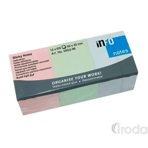 A(z) Jegyzettömb InfoNotes öntapadós, 40x50 mm, 12x100 lap, PASTEL mix egy megbízható, magas minőségű termék a(z) öntapadó jegyzettömbök és adagolók kategóriában, amely különösen népszerű a hobbi- és kézműves vásárlók körében. Használata egyszerű, dizájnja modern, és praktikus tulajdonságai miatt sokféle célra ajánlható. Kiemelkedően jól fogy ünnepi időszakokban, iskolakezdéskor vagy kreatív kampányok idején jó választás, ha boltodban keresett és értékálló terméket kínálnál.